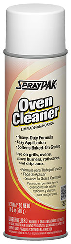 SprayPAK® Oven Cleaner rapidly softens hard, black, baked-on grease and built-up food deposits in institutional ovens. The most hard-baked food deposits are easily removed without scraping. Effective daytime or nighttime cleaner.
