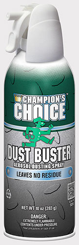 Dust Buster aerosol dusting spray blasts dust, lint, metallic oxide deposits, microscopic contaminants and other soils from surfaces. Nonabrasive. Odorless. Moisture-free. No harmful solvents. Leaves no residue. Includes a polyethylene extension tube for spraying hard-to-reach places.